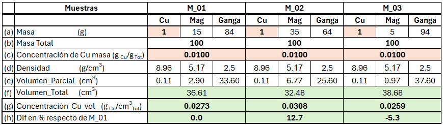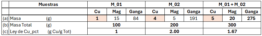 Concentration (X) % = 100 *(masa)X/(masa)Tot, that is, the amount in grams of the element of interest (X) relative to the total mass of the sample ((mass)Tot), multiplied by 100 to obtain the concentration in %. Table 1 presents two samples used to determine their additivity. They are separated into three components to later understand the effect of density. Sample M_01 weighs 100 grams (see row b), with 1 gram of Cu (see row a), 15 grams of Mag, and 84 grams of gangue, resulting in 1% Cu (see row c). For sample M_02 the result is 2% Cu. In the last column, both samples are mixed, and applying the definition, a grade of 1.67% Cu is obtained.