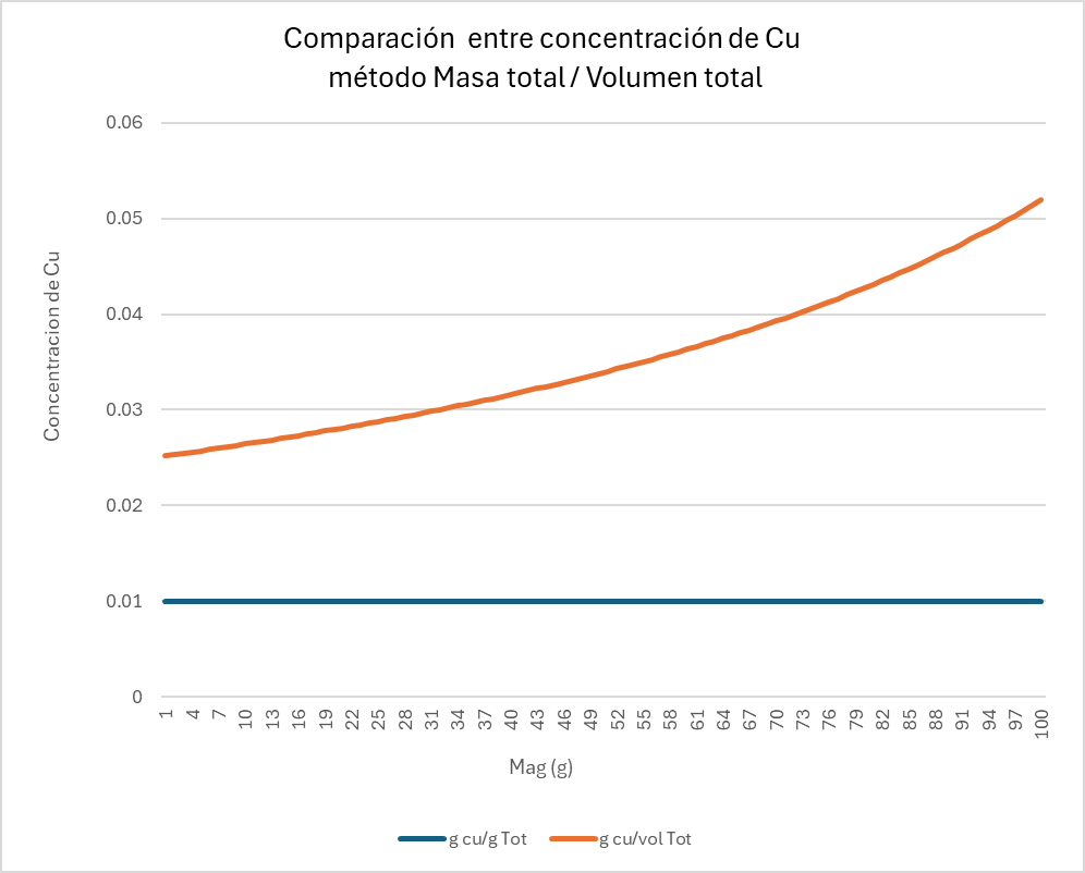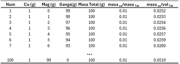 To visualize the relationship between the concentration variables defined in total-mass space and volumetric space, Table 3 was constructed using the previous definitions. This table contains 100 samples with a constant total mass of 100 g. Each sample is composed of Cu, magnetite (Mag), and gangue. The Cu content is constant in all samples (1 g), while the amount of magnetite increases progressively from 0 g to 99 g, with the gangue reduced proportionally.